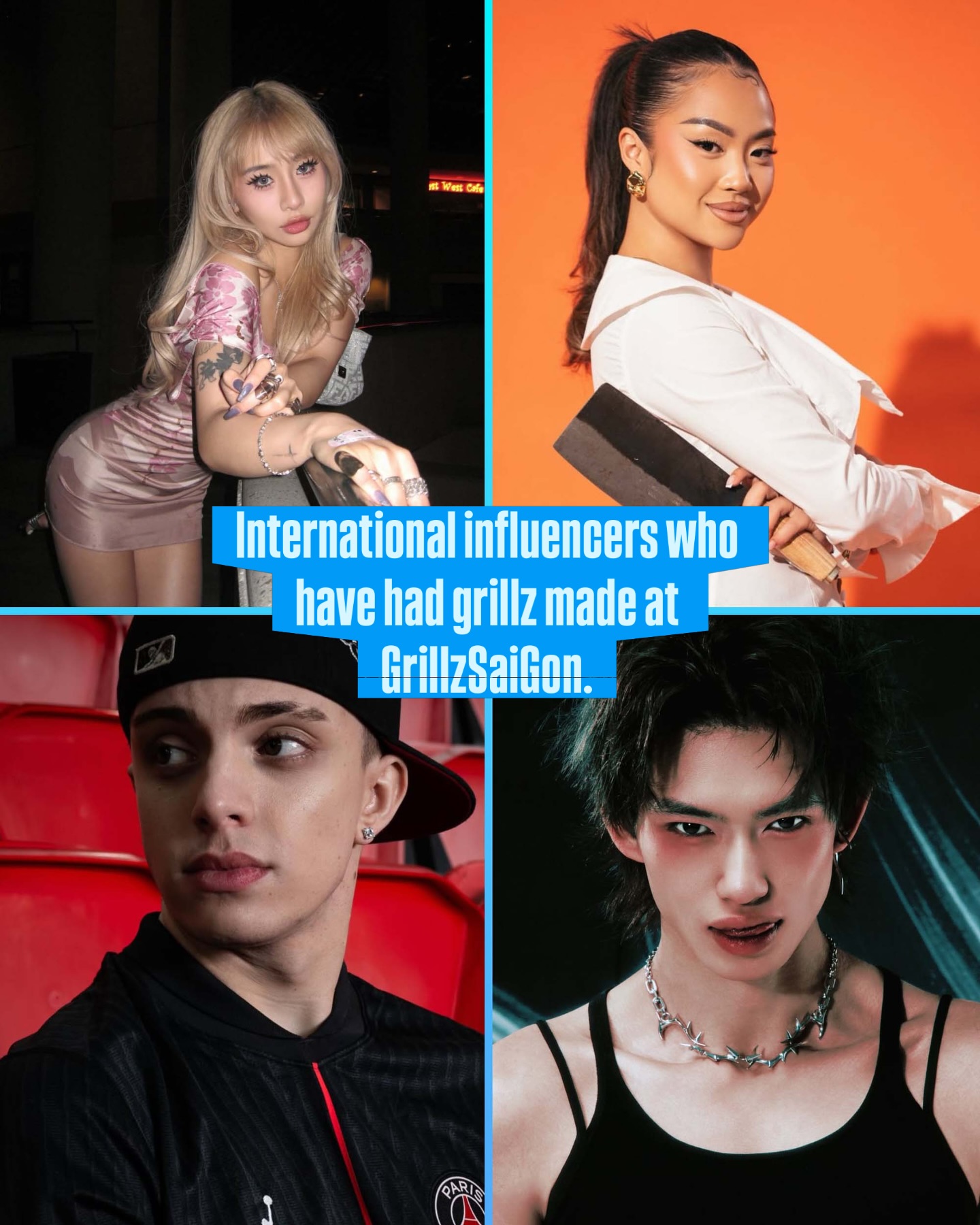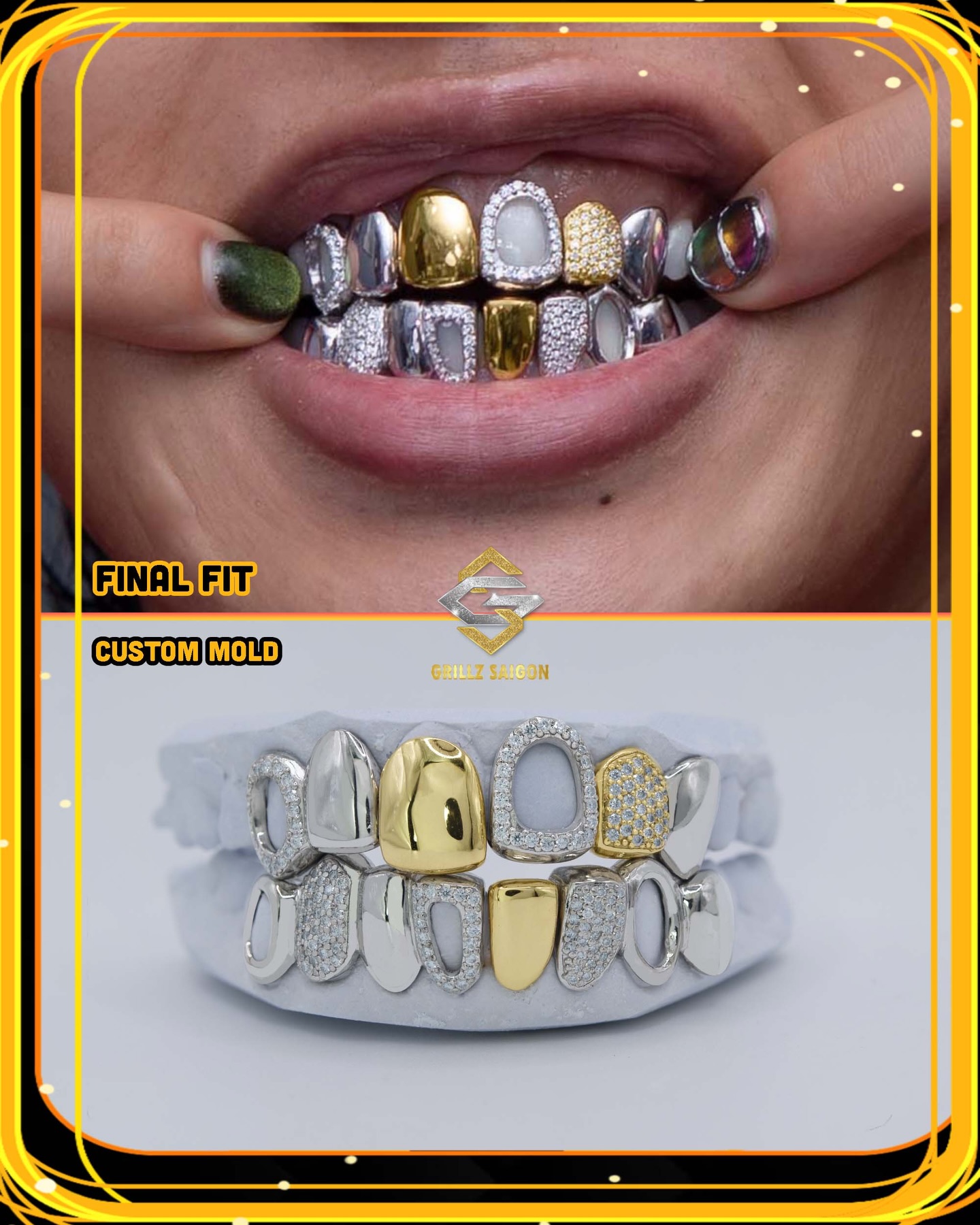 Tất cả các mẫu Grillz đều có thể làm từ chất liệu Bạc S925 hoặc Vàng 10K, 18k hoặc Grillz lẻ cho đến Full nguyên hàm. Quy trình lấy khuôn răng chuyên nghiệp giúp nắm bắt chính xác hình dáng răng của bạn, Grillz SaiGon đặc biệt chú trọng đến trải nghiệm đeo thoải mái, kết hợp cùng kĩ thuật nha khoa hơn 9 năm, chúng tôi cam kết có thể chăm sóc trọn vẹn cho răng của bạn.